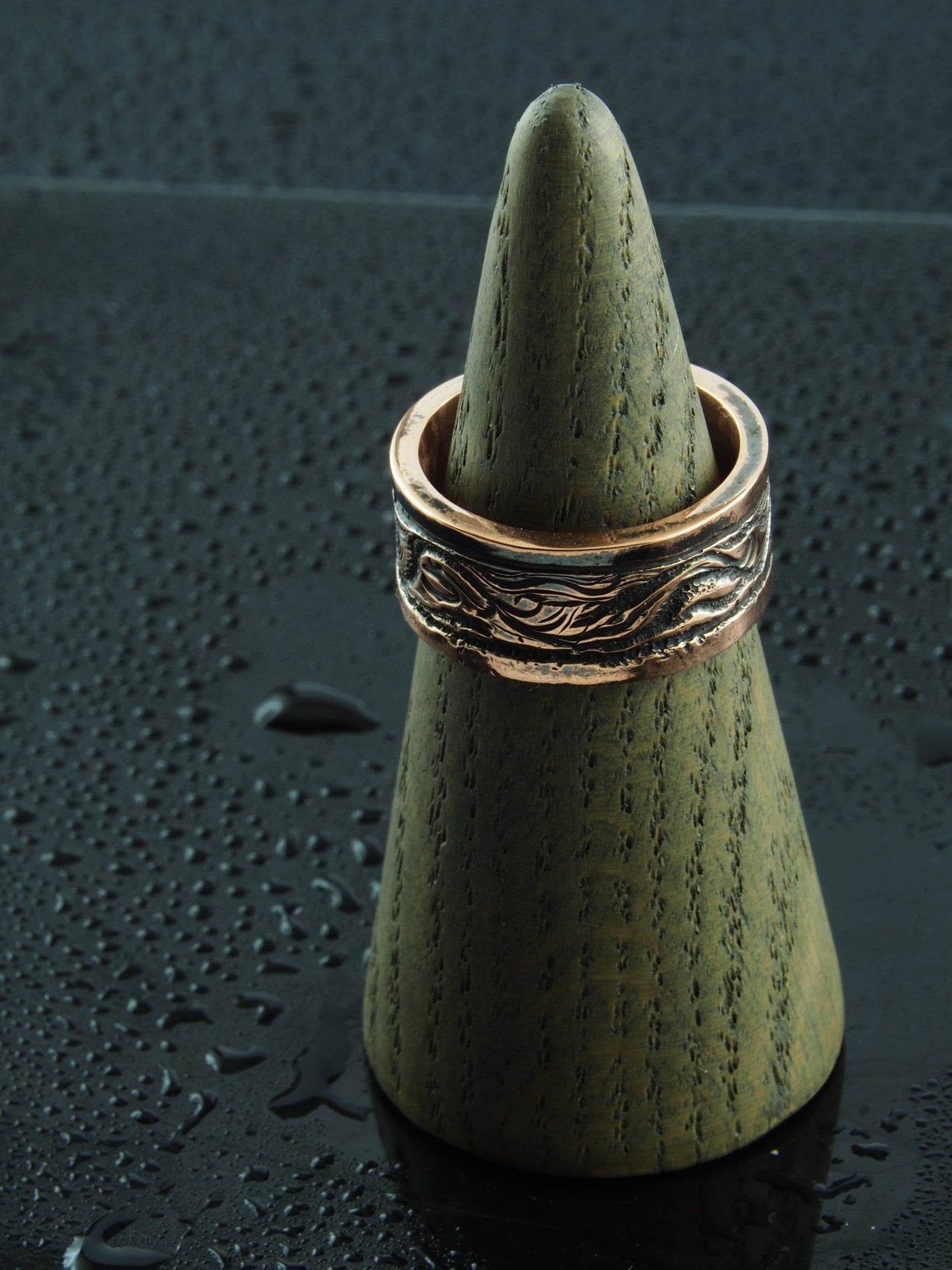 Inel cupru gravat manual, lucrat integral manual din cupru de puritate mare cu gravuri organice.